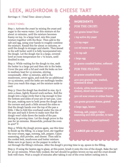 Lately, it’s been raining with no sign of a reprieve coming anytime soon–day after day of rain. And if you’re anything like me, weather like this makes you crave a warm and comforting dinner that’s sure to raise your spirits. This cheese, leek and mushroom tart with a bread crust does just that–so well so, that you’ll even want to whip it up when it’s nice and sunny outside!